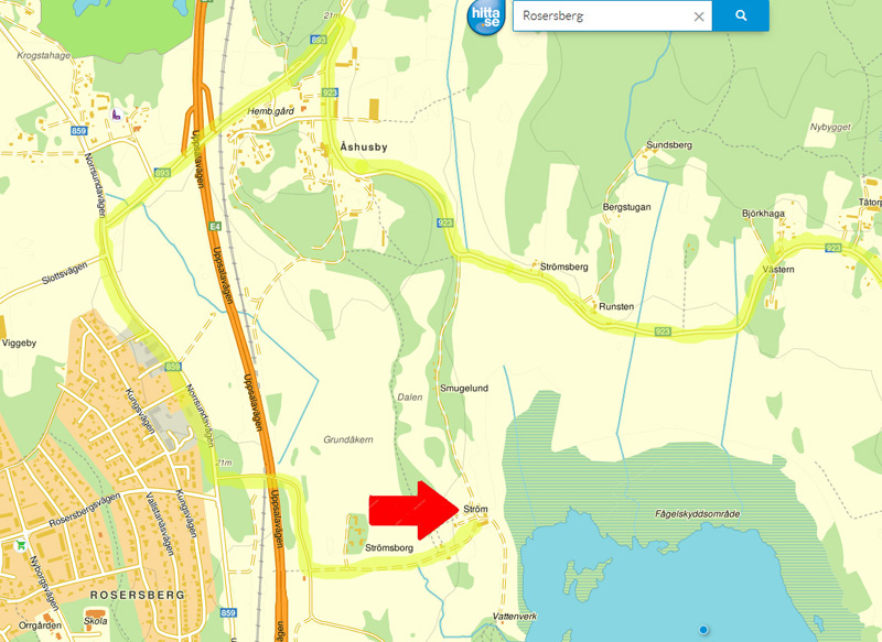 väg till Åshusby, där du kör ut åt vänster på en större väg (893) som