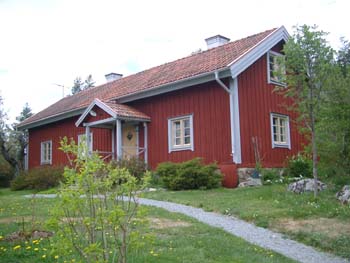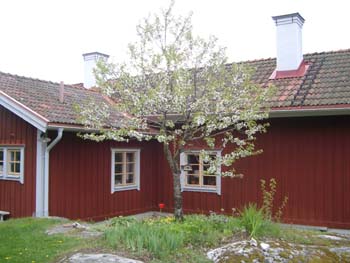 ![]() Blommande fruktträd på baksidan. Soldattorpet är tillbyggt både hitåt och åt höger. |