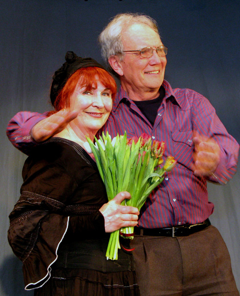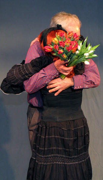 Hembygdsföreningens ordförande Gunnar Bergsten överlämnade ett fång tulpaner till Kim efter föreställningen.